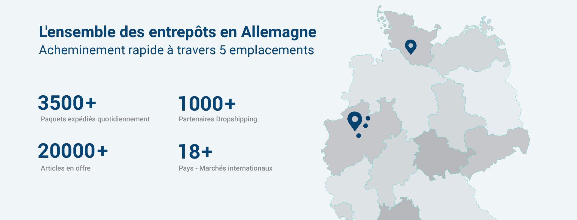 Pour relever ces grands défis logistiques, nous avons besoin d'une équipe qualifiée, capable de répondre à nos besoins. Fondée en 2003, CLP Trading GmbH est un pionnier du commerce électronique. Avec une croissance constante, nous sommes devenus des professionnels de la vente en ligne et de la logistique associée des meubles et des produits de l'habitat. Un savoir-faire dont bénéficient déjà plus de 1 000 partenaires de drop-shipping. Grâce à nos nombreuses années d'expérience, à notre vaste gamme de produits et à nos entrepôts modernes sur différents sites. Nous sommes à vos côtés pour vous accompganer dans votre introdiction sur le marché du commerce électronique.Grâce à notre longue expérience dans le domaine, nous offrons efficacité, performance et rapidité.